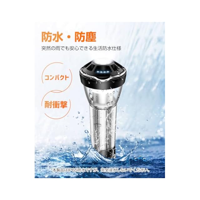 【3種の光源・4つの点灯モード・無段階調光】LEDランタンには3つの光源が搭載されており、暖かい光、白い光、赤い光が選択可能です。4つの点灯モードは、懐中電灯モード、白色点滅モード、キャンプライトモード、赤色点滅モードです。LEDライトや懐中電灯モードでは、スイッチを長押しすることで光の明るさを無段階に調節できます。これにより、周囲の環境に適した光や雰囲気を作り出すことができます。IPの65防水防塵仕様は、一般的な雨やほこりから保護し、アウトドアの変化する環境に対処します。ただし、長時間水に浸してはいけません。水がたまっている場合は、照明に影響を与えないように早めに清潔な布で拭き取ってください。