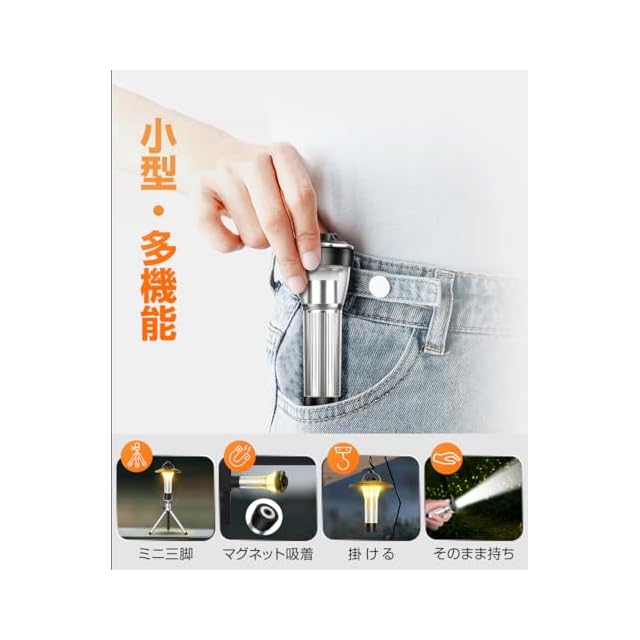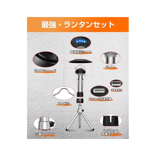 【個性的なデザイン・充実のパッケージ内容】本体だけで手軽に懐中電灯としても利用可能。先端に付いたステンレスフックで、木やテントに吊り下げて照明としても使用可能。マグネットベースは金属に吸着し、多彩な角度で利用できます。三脚を組み立てると、キャンプ場のテーブルやピクニックマットに置いてキャンプライトとして活用できます。パッケージには、ランラン本体×1、充電ケーブル×1、ランプカバー×1、マグネットベース(本体付)×1、三脚スタンド×1、日本語取扱説明書×1が含まれています。