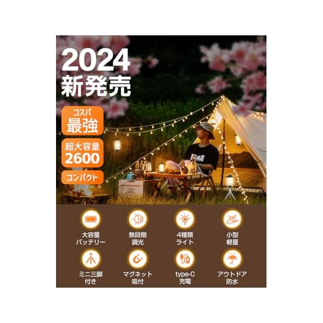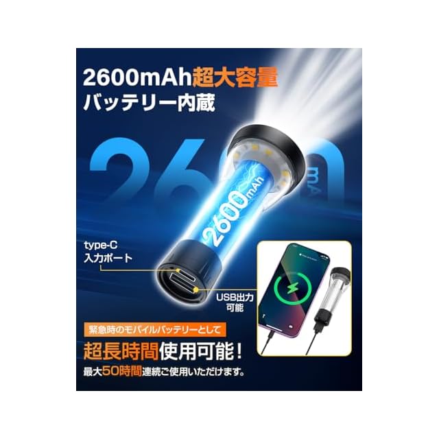 【最大50時間持続・予備電源付き】2600mAHのバッテリーを搭載し、最大50時間の連続点灯が可能。キャンプ用ランタンや懐中電灯として、180 ~ 370ルーメンの明るさ調節が可能で、シーンに合わせた照明モードの切替が自在。さまざまなアウトドア活動に対応する1台です。Type-Cポートを搭載し、緊急時にはスマートフォンの充電も可能。アウトドア愛好家向けの本格的なマルチライトです!
