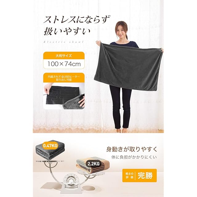 【使い方色々】肩掛け用のフックも付いており、肩、腰、お腹、もも、膝、足など全身のあたために使用できます。自宅のソファー、部屋のベッド、オフィスの椅子、車内、テント内などに適用。【パッケージ内容】毛布本体(ヒーター部&コード付き、毛布内部に収納)、取扱説明書(書付き)。【一年安心付き】万が一商品に不具合がある場合は、商品ページの販売元店舗をクリックして、「質問する」ボタンより店舗までご連絡いただければ迅速に対応いたします。