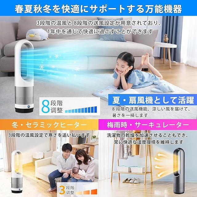 扇風機 羽なしタワーファン【2025冷暖兼用・羽根無し】8段階送風&3段階温風切替 左右100°首振り 9Hタイマー機能 温風 冷風 広範囲送風 羽根なし リビング扇風機 強力送風 大風量 リモコン付 暖風送風 ファンヒーター 過熱保護 転倒安全装置 即暖 省エネ 節電 子供部屋 リビング 寝室 キッチン 脱衣所 洗面所 トイレ オフィスに適用 PSE認証済 日本語説明書