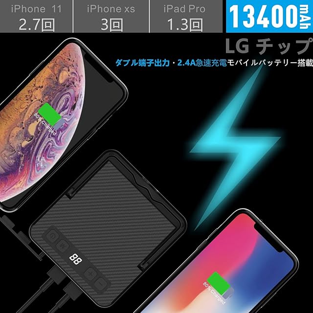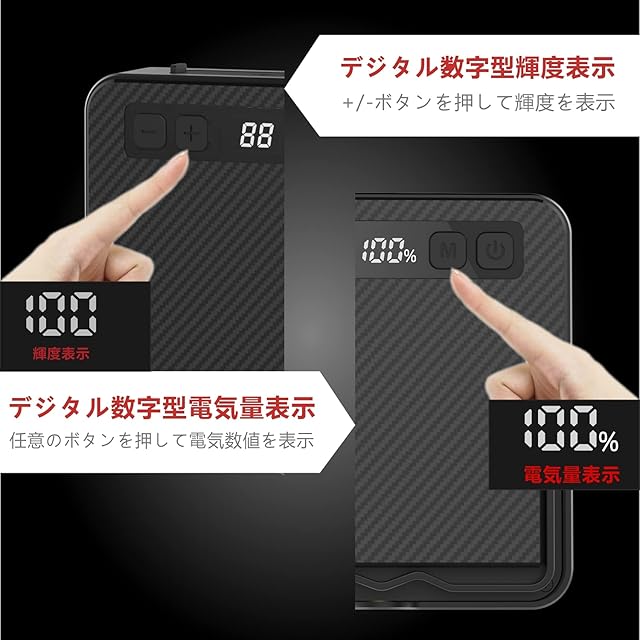 :「電気量/明るさデジタル数値表示」:無段階調光機能搭載で、調節中の明るさを1~100にコントロールできます。電気残量は1%~100%で表示し、とても便利です。光色輝度記憶機能搭載で、消灯前に設定した光色輝度を再度に点灯できます。