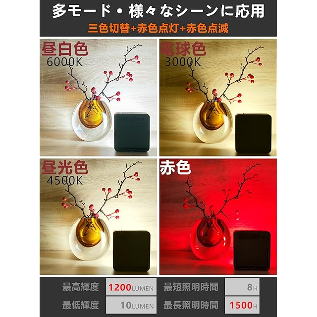 :「色んな場所に適用」:最強1200ルーメン照明可能で、日常の照明や、停電時、災害など暗闇で光りを提供します。三脚接続可能で、撮影時に補助光として使用可能で、色々な場所に適用します。