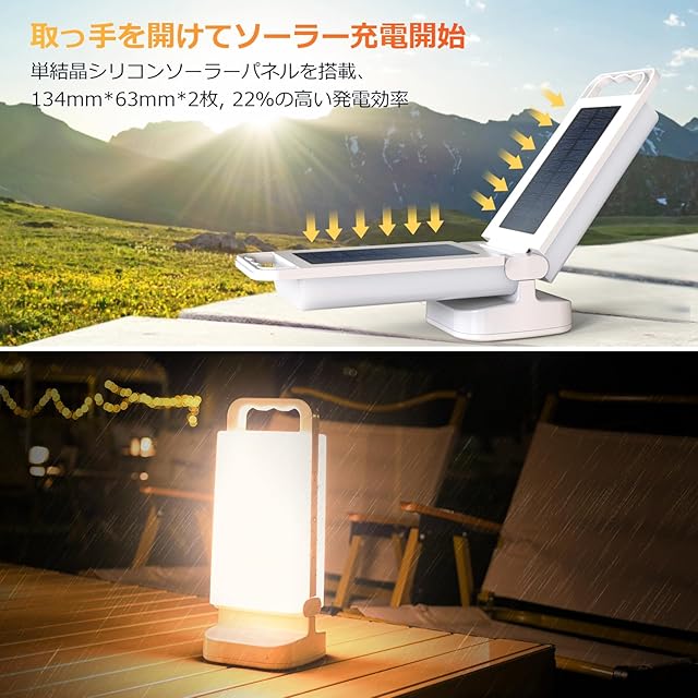「高効率のソーラー充電&モバイルバッテリー機能」このソーラーランタンは134*63mmの2枚単結晶シリコン太陽光パネルを搭載し、安定した発電効率で蓄電します。ランプ部の取っ手を両方へあけて、隠したソーラーパネルを露出し、太陽光へ向けて発電開始。天気が晴れる日は約8時間で満充電できます。さらに、ソーラー6000mAhの大容量内蔵電池を備えており、災害用、モバイルバッテリーとしてスマホへの充電も可能です。【※スマホ充電のご注意:アイフォン8以前の機種はスマホシステムの原因で充電受け入れできませんです。アイフォン8以降は通常に充電可能。】