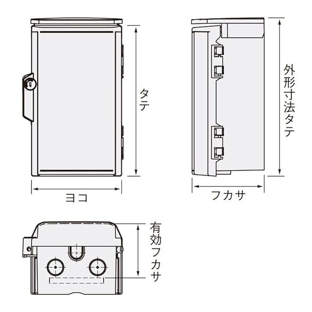 ●耐候性に優れた屋外用キー付プラボックスです。<br>●N200番キーによる施錠が可能です。<br>●耐候性の良いAAS樹脂の採用により、日差しによる変色や機械強度の低下が少なく、CATV関連機器、通信用無線機器の収納用など、キャビネットの耐候性を考慮する場合に適しています。<br>●取手部とキー部が一体の新ロック構造により、機器収納スペースが広くとれます。