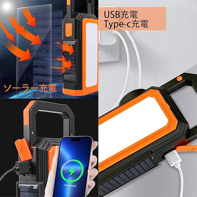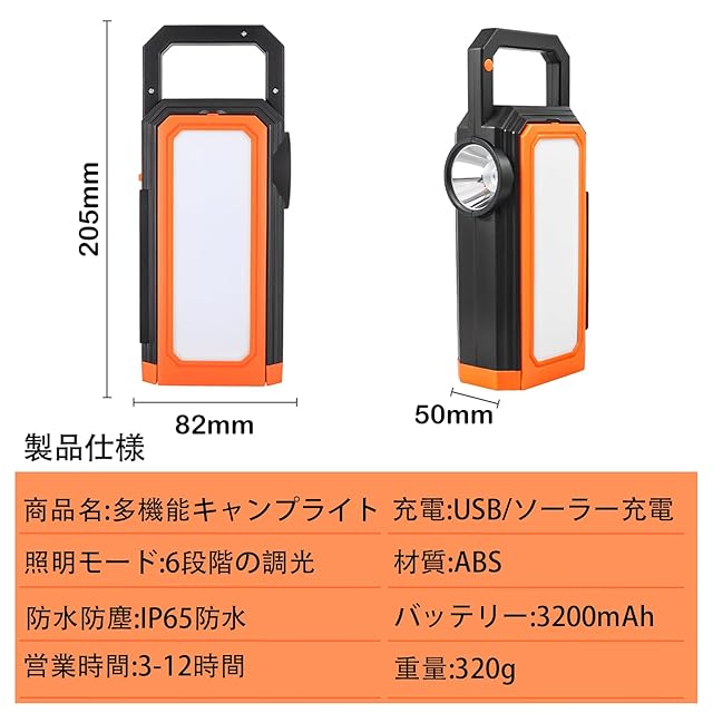 急速充電器を使用することはできませんが、元の基板を燃やす可能性があり、その結果、動作しなくなる(当社の製品は、アダプタを使用する5V = 1Aの低電力を必要とする)【ランタン 防災 ソーラー二つの充電モード】ソーラー充電/Type-C充電:ソーラーパネルなら8~10時間、USBバッテリーなら約4時間でフル充電できます。多結晶シリコンソーラー充電パネルは、屋外で電源がない場合の緊急ソーラー充電に使用できます。ご注意:初めてご使用になる前に、製品を十分に充電してからご使用ください。