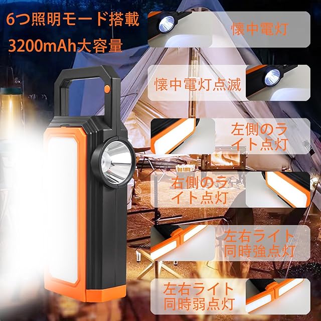【ランタン6つの照明モード】使用習慣や使用シーンに合わせて6つの照明モードを自由に切り替えることができます。 6つのモードとは、円形ライトが常時点灯、円形ライトが点滅、左側のパネルが単独点灯、右側のパネルが単独点灯、両方のパネルが同時に強く長く点灯、両方のパネルが同時に弱く長く点灯です。