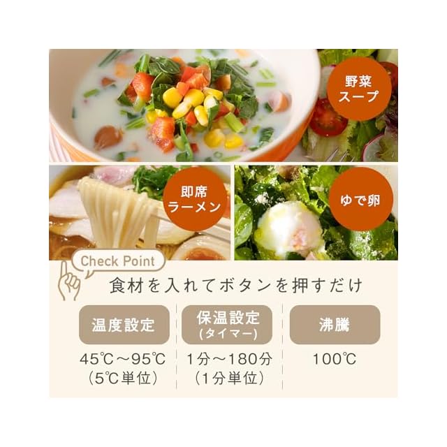 湯沸かし、低温調理(45℃~95℃、5℃単位で設定可能)、保温機能(1分~180分、1分単位で設定可能)、出汁取り、煮込み料理、離乳食、ゆで卵など様々な料理が簡単にできます。