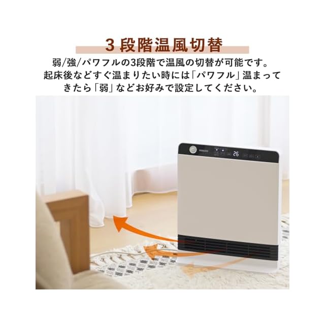 【3段階温風切替】利用シーンに合わせて弱・強・パワフルの3段階で温風の切替が可能です。起床後などすぐ温まりたい時には「パワフル」 温まってきたら「弱」などお好みで設定してください。