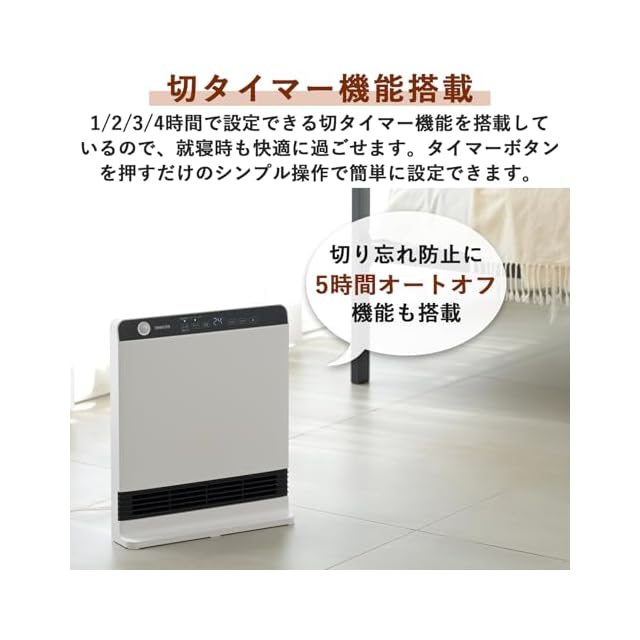 【切タイマー】1/2/3/4時間で設定できる切タイマー搭載。就寝時や切り忘れ防止に役立ちます。また、安全機能として、運転開始後何も操作をしないと5時間で運転を停止するオートオフタイマーも搭載しています。※センサー運転時はオートオフ機能は作動しません。