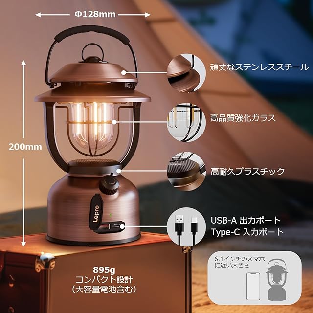 ランタン led USB 充電式 高輝度 暖色と白色切替 無段階調光 電池残量インジケータ 付き レトロ アンティーク風 コンパクト 軽量 小型 アウトドア キャンプ 登山 釣り 防災 車中泊 非常用 ブランド:Lepro 特徴:高輝度の出力により、明るさは最大1000ルーメンに達し、目にも優しいです。点灯時間は最大160時間、様々な場面で活躍します。調光、調色機能も付きで、 スイッチを押して使用 シーンに応じて自由に調光・調色できます。150ルーメン(電球色)・1000ルーメン(昼光色)の2色モードが調節できます。防水性能はIPX4に達し、小雨の程度は大丈夫です。フックが 付いており、吊り下げることもでき、利便性が高いです。 サイズは140mm×140mm×200mm、重量は 895gで、持ち運びに便利で、キャンプ、釣り、ハイキング・、仕事、散歩等様々な場所に適しています。便利なUSB充電式で長時間稼働できます。キャンプ・釣り・ハイキング・仕事・散歩等様々な場所に適しています。