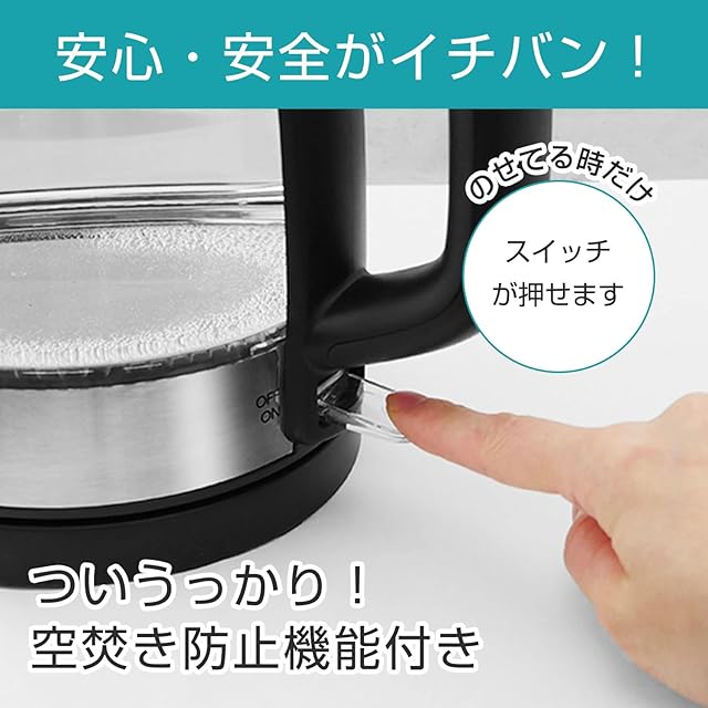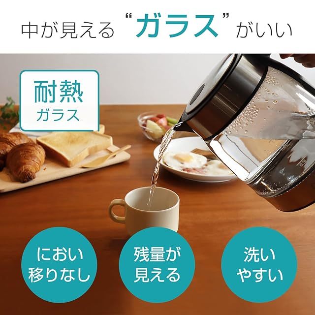 耐熱ガラスを仕様したおしゃれなガラスケトル。プラスチック特有のにおいもなく、残量が見えるので、残り湯の捨て忘れなどを防ぐことができます。透明なので、隅々まで洗いやすく、衛生的です。
