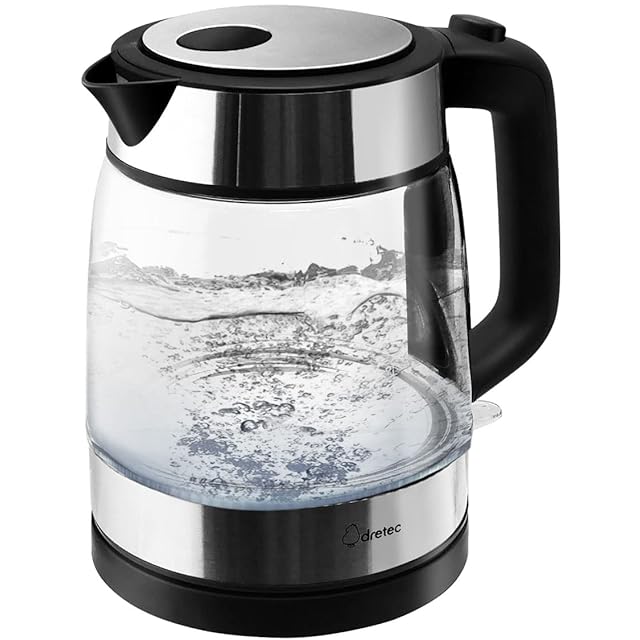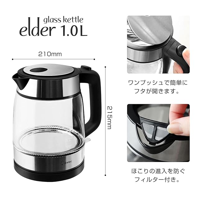 dretec(ドリテック) 電気ケトル ガラス 1.0L LEDライト付き 900W ハイパワー おしゃれ におい移り防止 ポット 湯沸かし 空焚き防止 ブラック