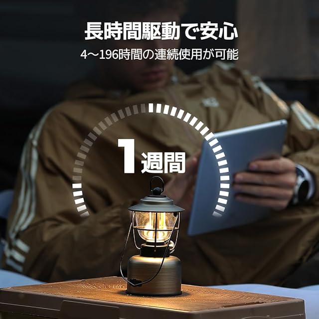長時間駆動で安心:4~196時間の連続使用が可能で、1回の充電で1週間以上使用可能。キャンプや停電時にも頼れるランタンです。
