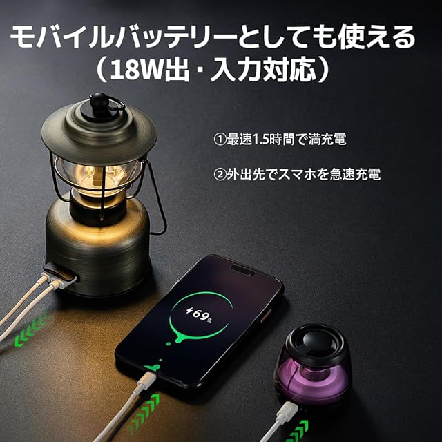 モバイルバッテリーとしても使える:18Wの急速充電対応で、スマホやタブレットを外出先で充電可能。緊急時にも便利な多機能ランタンです。