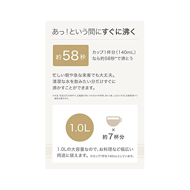 カップ1杯分(140cc)が58秒で沸くので、忙しい朝も手軽に使える