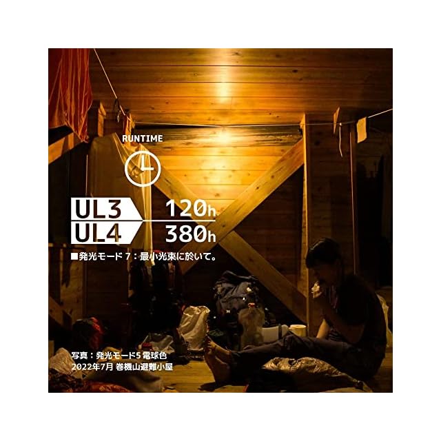 ■照射距離:12m(フラッシュライトモード)■点灯時間:最大380h(3lm使用時) ■調光:無段階・モードメモリー機能付き ■発光:7モード 電球色・昼白色■バッテリー:リチウムイオン充電池 ■電圧/容量:3.7V/3000mAh ■充電:USB Type C(ケーブル付属) ■充電時間:(約)3.5h ■充電サイクル:500回(新品時容量の80%以下となる回数)