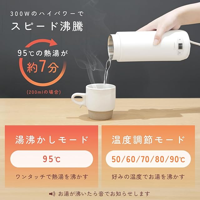 【スピード沸騰】小さくても300Wのハイパワー!最高温度95℃の200mlのお湯がわずか約7分で沸かせます。沸くとお知らせ音が鳴るのでわかりやすい!