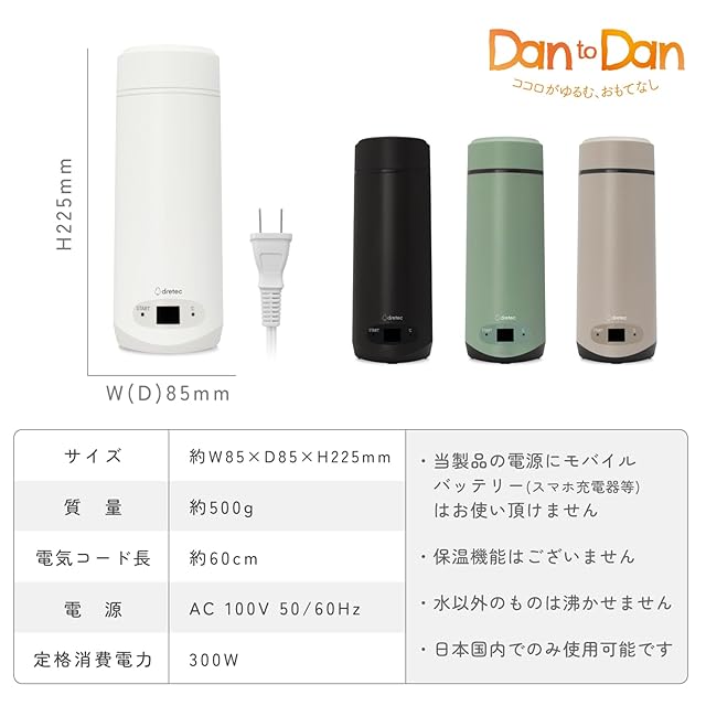 【製品仕様】サイズ:約W85×D85×H225mm、質量:約430g、電源:AC 100V 50/60Hz、定格消費電力:300W、最大容量:0.35L、設定温度:湯沸かしモード:95℃ 温度調節モード:50/60/70/80/90℃、電源コード長:約 60cm、:メーカー1年