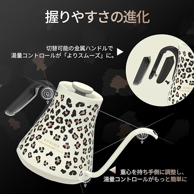 【手に馴染む快適なハンドルデザイン】EPEIOSコーヒーケトルは、手首や腕への負担を軽減する「人間工学」に基づいたハンドル設計を採用。熱くならないように持ち手を設計し、安心して使用できます。自然と適切な注ぎ角度を保てるデザインで、初心者でも簡単に扱え、誰でも美味しいコーヒーを淹れられるよう工夫されています。さらに、90°の注ぎ角度で流量や速度を細かく調整可能。注ぎ口の形状も改良され、よりスムーズで正確なドリップを実現しました。取り外し可能なカスタマイズハンドルは、安全性と断熱性に優れ、デザイン性も兼ね備えた仕様。機能美とデザインを兼ね備えた一台で、コーヒードリップの楽しみを最大限に引き出します。