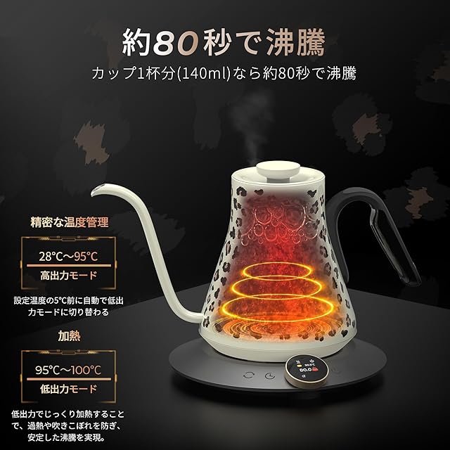 【約80秒でスピード沸騰】1040Wの高出力により、短時間でお湯を沸かすことが可能。カップ1杯分(140ml)なら約80秒で急速加熱できます。食品グレードのステンレス製で耐久性に優れ、錆びにくく、有害物質が溶け出す心配もなし。さらに耐熱・保温性にも優れ、メモリー機能や空焚き防止機能も搭載され、安全性にも配慮されています。いつでも簡単にお好みの温度設定ができ、素早く美味しいコーヒーを淹れられます。