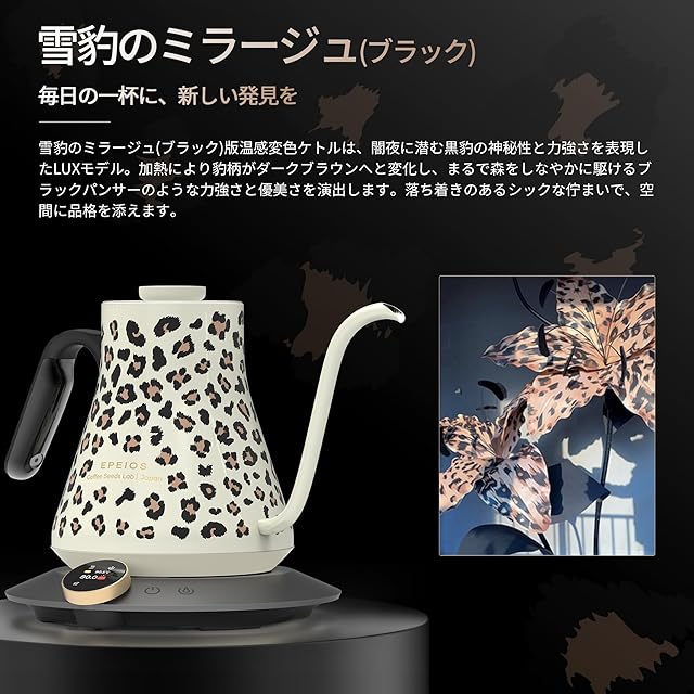 【温度がつくり出す、美しい色の変化】エペイオス温感電気ケトル「ブラックレオパード」は、温度で模様が変化する特殊プリント技術を採用したシリーズでの上位モデルです。闇夜にひっそりとたたずむ黒豹の神秘的な雰囲気と、しなやかで力強い動きを表現しています。加熱が進むにつれて、ポットの表面にヒョウ柄が徐々に現れ、ダークブラウンの模様が浮かび上がります。それはまるで、森の中を静かに駆け抜けるブラックパンサーのような、優雅で力強い存在感。落ち着きのあるマットブラックの本体が、キッチンに上質で洗練されたアクセントを加え、空間全体に気品をもたらします。