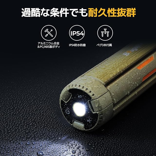 【防水性能IP54】 防水仕様(IP54)で雨や埃にも強く、様々な環境で安心して使用できるアウトドア用ライトです。