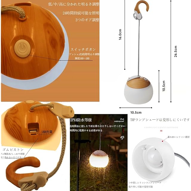 充電式LEDランタンとして、 LEDランタンはリチウムバッテリー内蔵、充電も簡単です。火を使わなく、熱によるやけどや火事の危険性がまずなく、お子さんがいる家庭でも使用が可能です。電源オンの状態で、2 秒間長押しすると温白色と白色光が切り替わり、短く押すとギアが切り替わります。