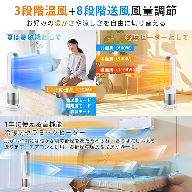 【2025新登場・冷暖兼用・羽根なし 】扇風機 タワーファン 温風 冷風 冷暖房 8段階送風&3段階温風 DCモーター 100°首振り 9hタイマー 強風&微風&静音モード 大風量 羽根なし扇風機 リモコン操作 縦型 スリムファン 転倒&過熱OFF 足元ヒーター セラミックファンヒーター 子供部屋/脱衣所/トイレ/キッチン/寝室/リビンク/書斎/ペット用 PSE認証済 日本説明書 ホワイト