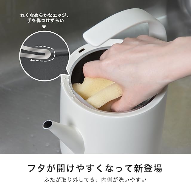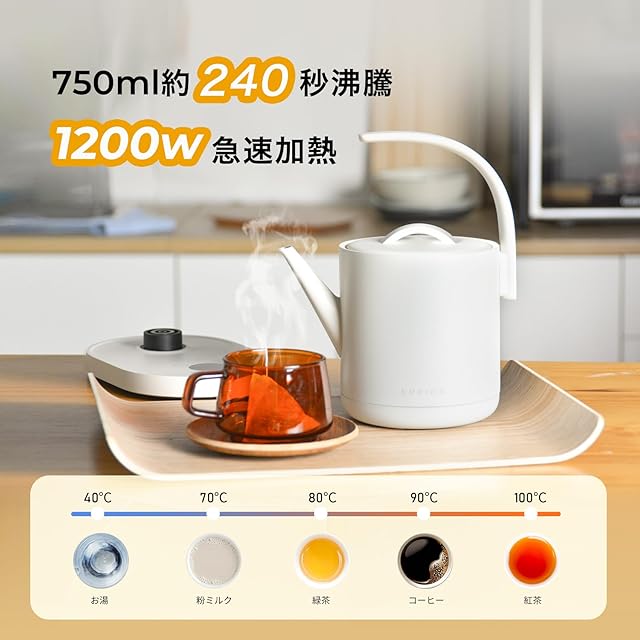 【240秒激早沸騰・安全な使用感を備えたケトル】 ①0.75Lなら約240秒で沸騰させられる1200wの安全な加熱技術を採用し、簡単に素早く湯沸かしができます。②ステンレス製本体で化学物質が溶け出す心配無し。③メモリー&空焚き防止機能を搭載しています。④マグネット式の蓋はケトルを傾けた際に落ちづらいよう、しっかりと吸着します。