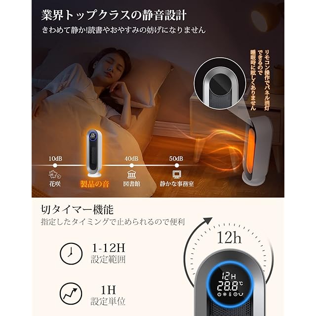 【12Hタイマー&消し忘れ防止6H自動OFF&メモリー機能】設定時間後自動的に電源がオフになるタイマー機能付き、生活リズムやシーンに合わせて、1H刻みで最大12H時間まで止めたい時間をタイマー設定可能。電源の消し忘れを防いだり、目覚める時間に合わせて動作させたりできる。また、タイマー設定しない場合でも6H後自動で運転を停止し、電気代が掛かりすぎることも防げ、余計な電気代も賢く節約できます。更に、暖房器具 省エネは前回電源OFF時の設定で運転するようにメモリー機能を搭載され、いちいちセットする余計な工夫がいらない、生活でもっと便利になります。