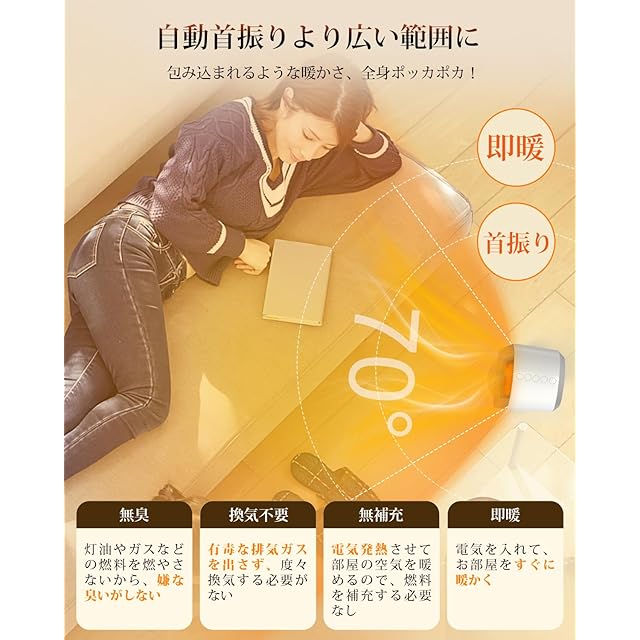 【もっと快適に、安心の暮らしを支える多重安全設計搭載】思わず蹴っ飛ばしたっり、不意の衝撃や地震などで転倒したりしまった時に自動で電源がオフになる「転倒オフ機能」。また、ひーたー内部の温度が上がり過ぎた時に自動で運転停止する「二重過熱防止機能」の安全機能は備えており、使用方法の不注意によるケガや事故が絶対に防げるわけではありません。ファンヒーター 電気の外装素材は「V0級難燃性安全素材」を使用され、高温でも燃えにくく安全性さらに固める。日本国内電気用品安全法(PSE)認証済です。安全・安心・安定・快適・満足な暮らしを提供します。