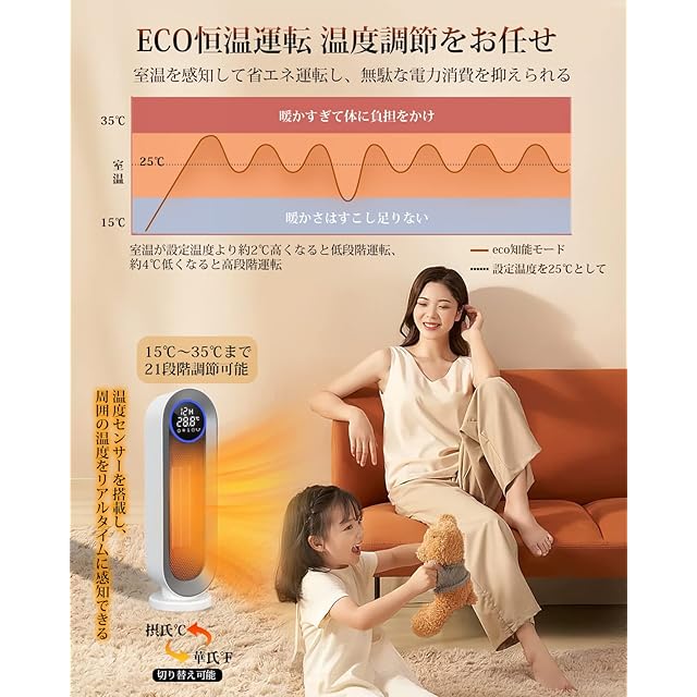 【自動首振りでより広範囲を暖める縦型電気ファンヒーター】自動首振り機能を備えており、本体を移動させなくても広範囲をしっかり暖め、家族団欒の席でも全員に温風を届けてくれます。また、電気ヒーターの高さが約50cmある縦長の送風口なので椅子に座った状態でも膝元や足元でも全身暖まることができます。スタンド型スリムタイプで場所も取らず、脱衣室などの狭いスペースでも余裕で設置できてあちこちに簡単に移動して使えていいですばやく効率的に充満させ、タワー型暖房器具 省エネ寒い季節に暖かさで包み込まれます!