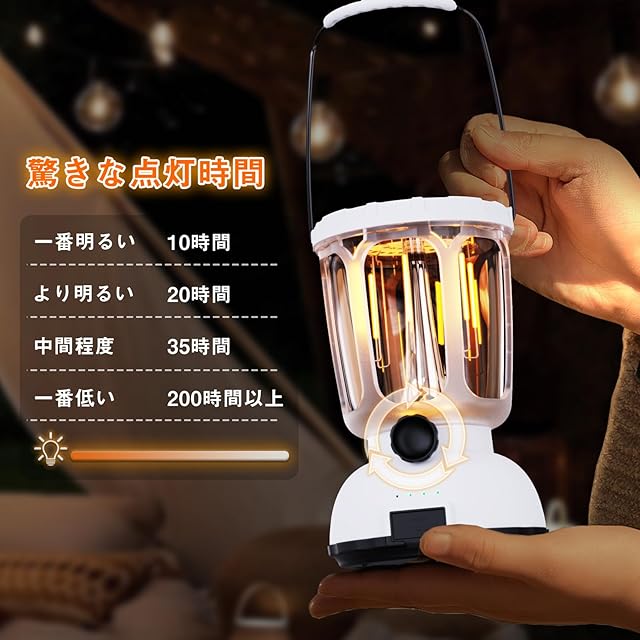【6000mAh内蔵バッテリー搭載で携帯機器の充電も可能】6000mAhの大容量充電式バッテリーを内蔵し、付属のUSB充電ケーブルで簡単に充電できます。頻繁な電池交換は必要ありません。また、モバイルバッテリーとしても利用でき、USBポートからスマートフォンやタブレットなどの携帯機器を充電できます。(ご注意:販売しているのは電池式ではなく、電気式ランタンですのでご了承ください。)