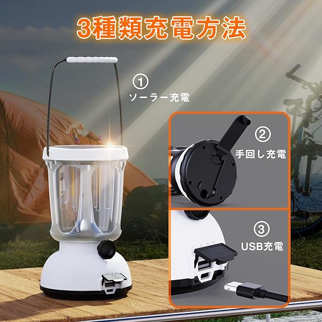 【3つの充電方法:ソーラー充電・USB充電・手回し充電】USB充電、ソーラー充電、手回し充電の3つの充電方法が選べるLEDソーラーライトです。フル充電すれば、最大650ルーメンで35時間以上使用可能です。ソーラーパネルやクランクを回して充電することができ、わずか3〜5分でスマホの起動に十分な電力を供給できます(充電時間は回転速度によって異なります)。災害や停電などの緊急事態でも、手回し発電機能によりいつでも電力を確保。スマホの緊急充電やライト点灯など、最も必要な瞬間に信頼できる電源となります。