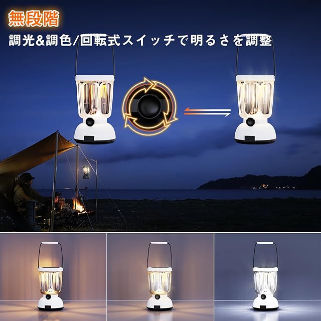 【無段階調光&調色/回転式スイッチで明るさを調整/雰囲気づくり】回転ボタンをゆっくり回すだけで、明るさを自由に調整可能。明るい作業用から柔らかい雰囲気光まで、一つで幅広い光のニーズに応えます。屋外でのキャンプやハイキング時は高輝度で作業をサポートし、ディナーやロマンチックな夜には柔らかい光で雰囲気を高めることができます。アウトドア用品としてだけでなく、室内のインテリア照明やパーティーの雰囲気づくりにも大活躍できます。