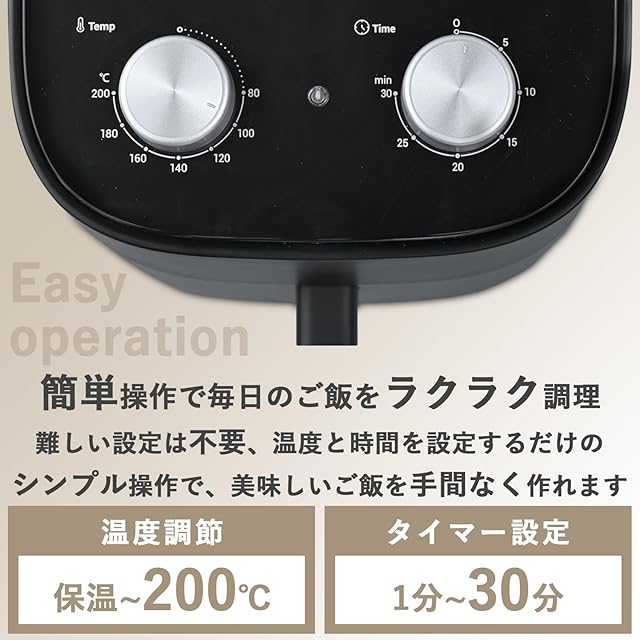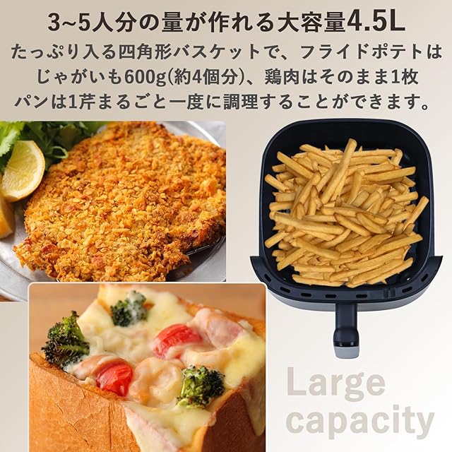 【大容量&ハイパワー】3~5人分の量が作れる大容量4.5Lでフライドポテトはじゃがいも600g(約4個分)、鶏肉はそのまま1枚、パンは1芹まるごと一度に調理できます。さらに1200Wハイパワーでスピーディに、熱風の循環で油を使わなくてもサクッとジューシーに仕上げます。