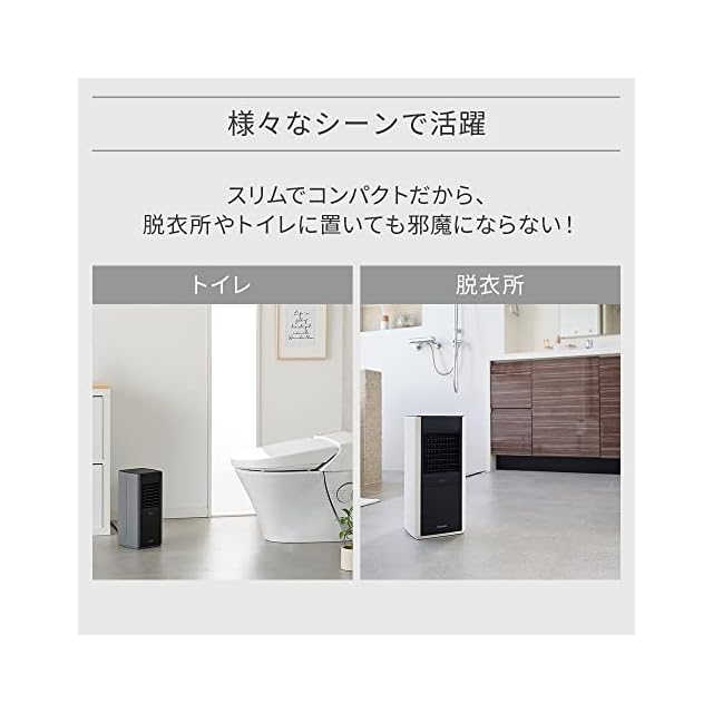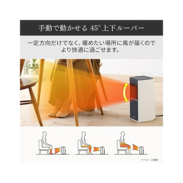 暖房の適用床面積目安(木造住宅/コンクリート住宅):[断熱材の厚みなし]約3畳(4.9m2)まで/約4.5畳(6.9m2)まで[断熱材の厚み50mm]約6畳(8.6m2)まで/約8畳(12.9m2)まで(※暖房の目安は、一般社団法人日本電機工業会の統一基準に準拠しています。室内外温度差15℃以内の地区で、暖房設定温度(暖房快適室温)20℃としたときを基準とし、1畳=1.65m2として小数点第1位を切り上げています。)