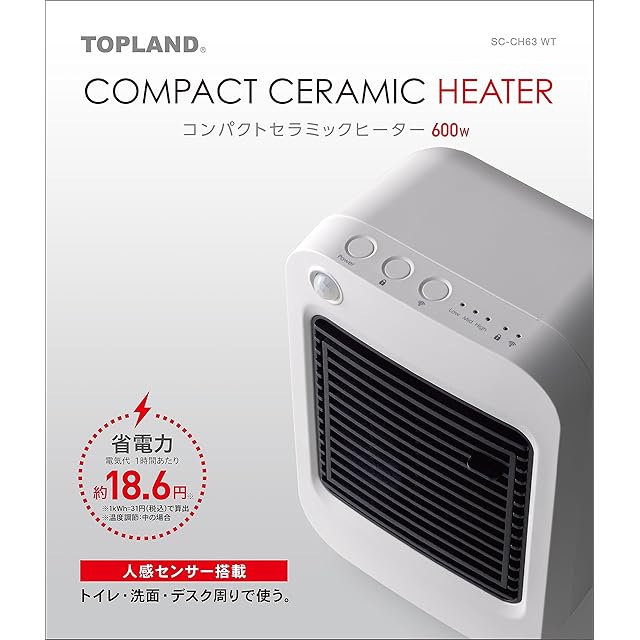 商品名:TOPLAND(トップランド) セラミックヒーター 600W 足元ヒーター 小型 人感センサー付 省エネ 速暖 トイレ 洗面所 脱衣所 チャイルドロック 温風調節3段階 角度調節 転倒時自動オフ機能 ホワイト SC-CH63WT
