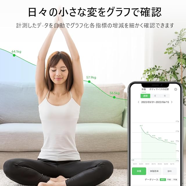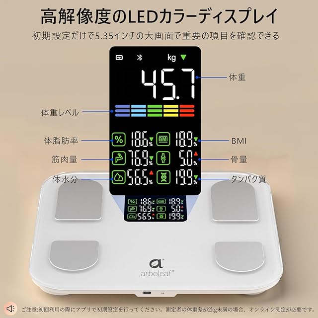 【高精度体組成計・スマホ連動】iOS/Android対応、App StoreやGoogle Playで「arboleaf」をダウンロードできます。4つの精密なセンサーと最先端BIA技術を利用、誤差わずか50g~150g。体重計を乗るだけBluetoothで専用アプリに接続すること、体重/体脂肪率/筋肉量/基礎代謝量/水分量など15項目の体の全体を測定、データを自動的にアップロードします。