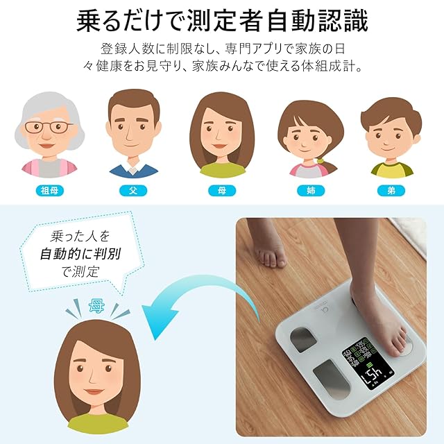 【BIA測定技術&家族の健康管理】精密なセンサーと最先端のBIA技術を採用で、誤差はわずか50g~150gです。登録人数の制限なし、素足で乗るだけ体の体組成を正確に測定し、家族全員の健康状態をわかる体脂肪計です。(※正確な数値を得るには、平らで硬めの床で姿勢を整えて測定してください)