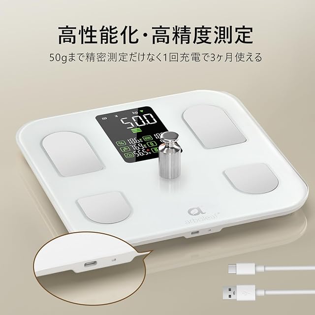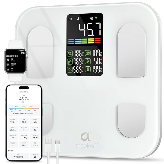 arboleaf 体重計 スマホ連動 体脂肪計・体組成計 Bluetooth対応 ヘルスメーター 乗るだけ あすけん連携【2025新登場】【アプリ対応/apple watch/GoogleFit/Fitbit/appleヘルスケア連携/体重/体脂肪率/筋肉量/BMI/15項目/測定者認識/高精度】充電式 家族一気に測定 日本国内サポート