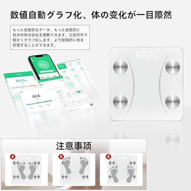 【体重計スマホ連動&iOS/Android対応】Bluetooth接続で、体重計に乗るだけで体重・体脂肪率・筋肉量など項目を測定と分析、測定データがスマホ連動します(アプリで事前登録が必要)。iOSとAndroidの両方に対応でアプリをApp StoreまたはGoogle Playから無料ダウンロードできます。