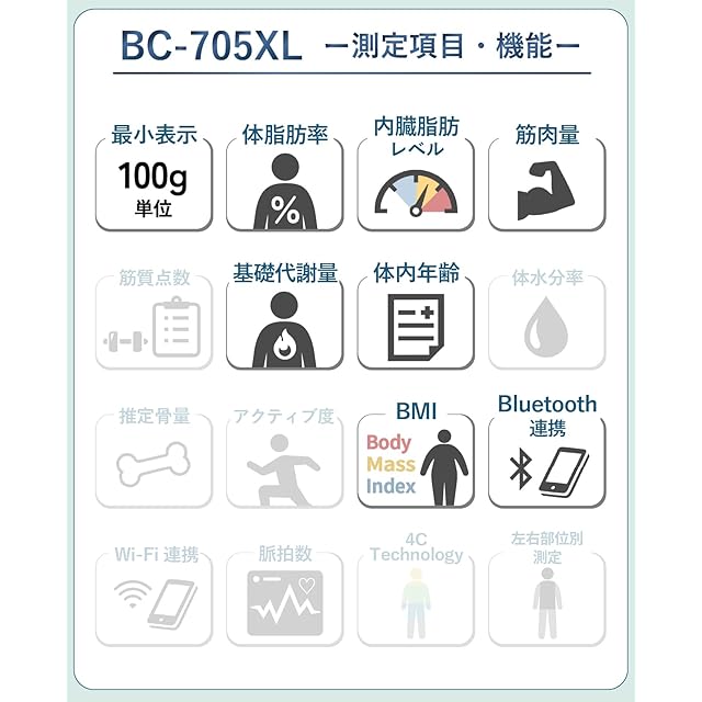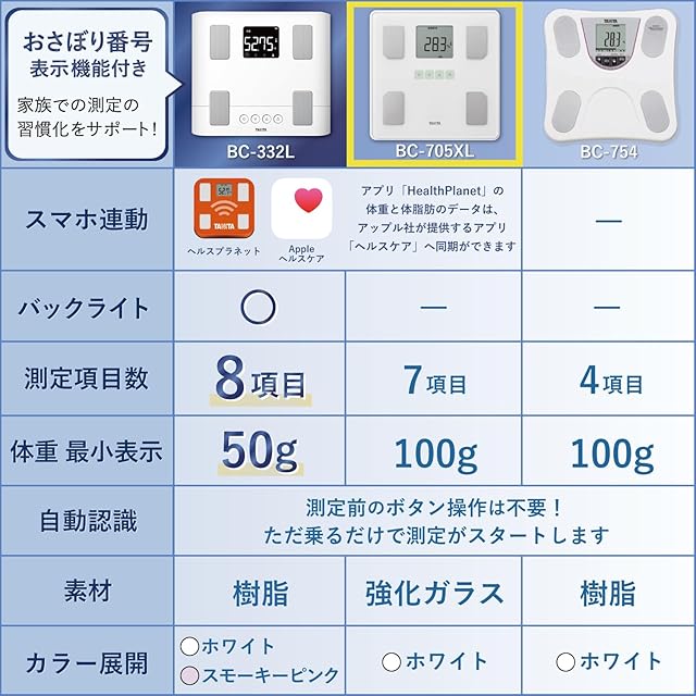 タニタ 体重計 体組成計 ヘルスメーター BC-705XL【体脂肪率/内臓脂肪レベル/筋肉量/基礎代謝量/体内年齢/BMI/スマホ連動/乗るピタ】