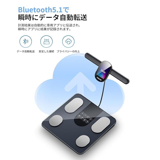 【Bluetooth5.1で瞬時にデータ自動転送】乗るだけで測定体脂肪計!使用簡単の上、計測結果は自動的に専用アプリに伝送され、瞬時にアプリに結果が記録されます。従来品のbluetooth4.0と比べて、伝送スピードと接続の安定性を向上します。