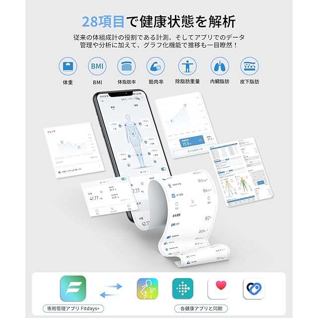 【体重・体組成計仕様】●計量範囲:5~180kg。●計量精度:0.01kg。●専用アプリ:Fitdays+。●接続方法:Bluetooth 5.1。●電源:Type-C充電式。●製品重さ:約2.54kg。●製品寸法:約35.5×31×5cm。