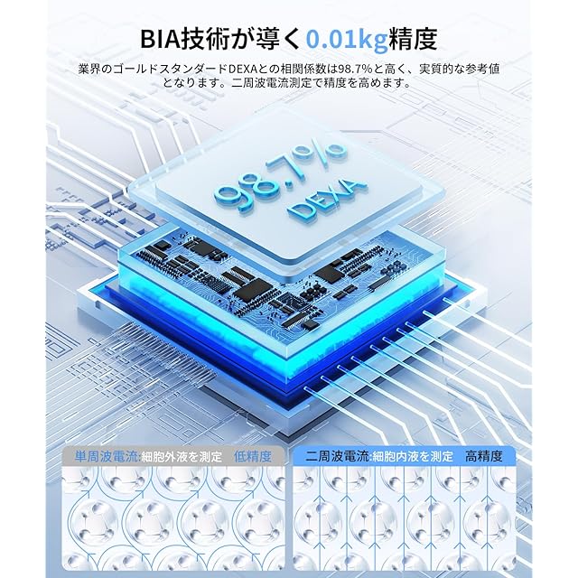 【BIA技術搭載でより真値へ】プロ体組成計のBIA技術を取り入れ、多周波数で体組成を測定することで、健康指標の正確性をより高めました。業界のゴールドスタンダードDEXAとの相関係数は98.7%と高く、実質的な参考値とります。普通の4電極は単周波数を測定しかできませが、測定結果の数が減り、関連性も低くなります。