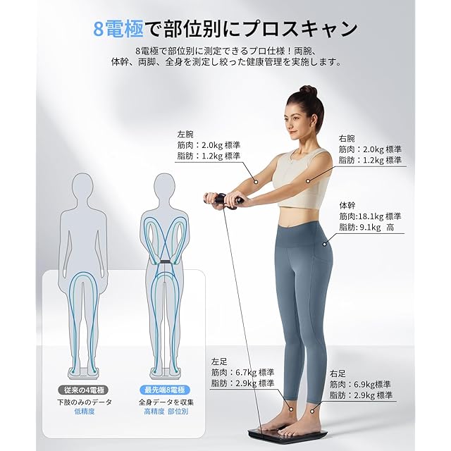 【8電極で左右部位别に正確測定】全身だけでなく、部位别に測定できるプロ仕様!左腕・右腕・左脚・右脚・体幹部の体脂肪率、筋肉量を測定し、細かくチェックしながら、日々のトレーニングに取り組めます。鍛えるべき部位と効率鍛えた効果の実感を可視化できます。