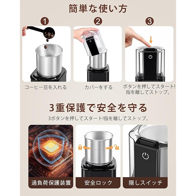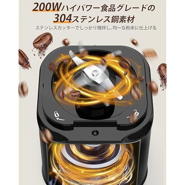 コーヒーミルは200wの強出力モーターを使用し、コーヒー豆を瞬間に粉砕し、貴重な時間を節約されることができます。 また、特殊刃の不均一研磨を低減、より細かく、均一に研磨頂けます。