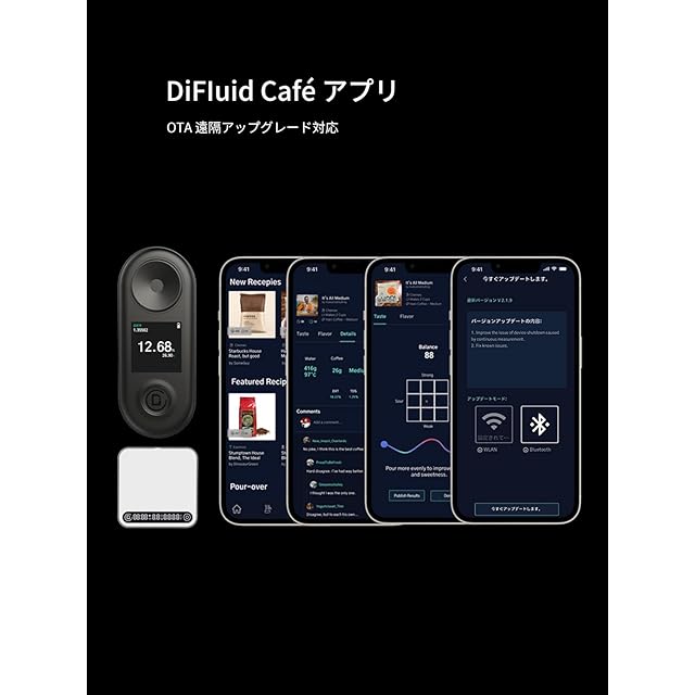 【DiFluid Café無料専用アプリ】専用アプリは、Google Play 、 App Storeより「DiFluid Café」で検索すればインストールできます。無料アプリ連携で遠隔アップグレード対応可能。アプリでは世界中のコーヒー愛好家を繋ぎ、地域や仕事の垣根を超えて人と人がつながるコミュニティがあり、レシビ、記録データ、自分の考え等を自由に共有できます。
